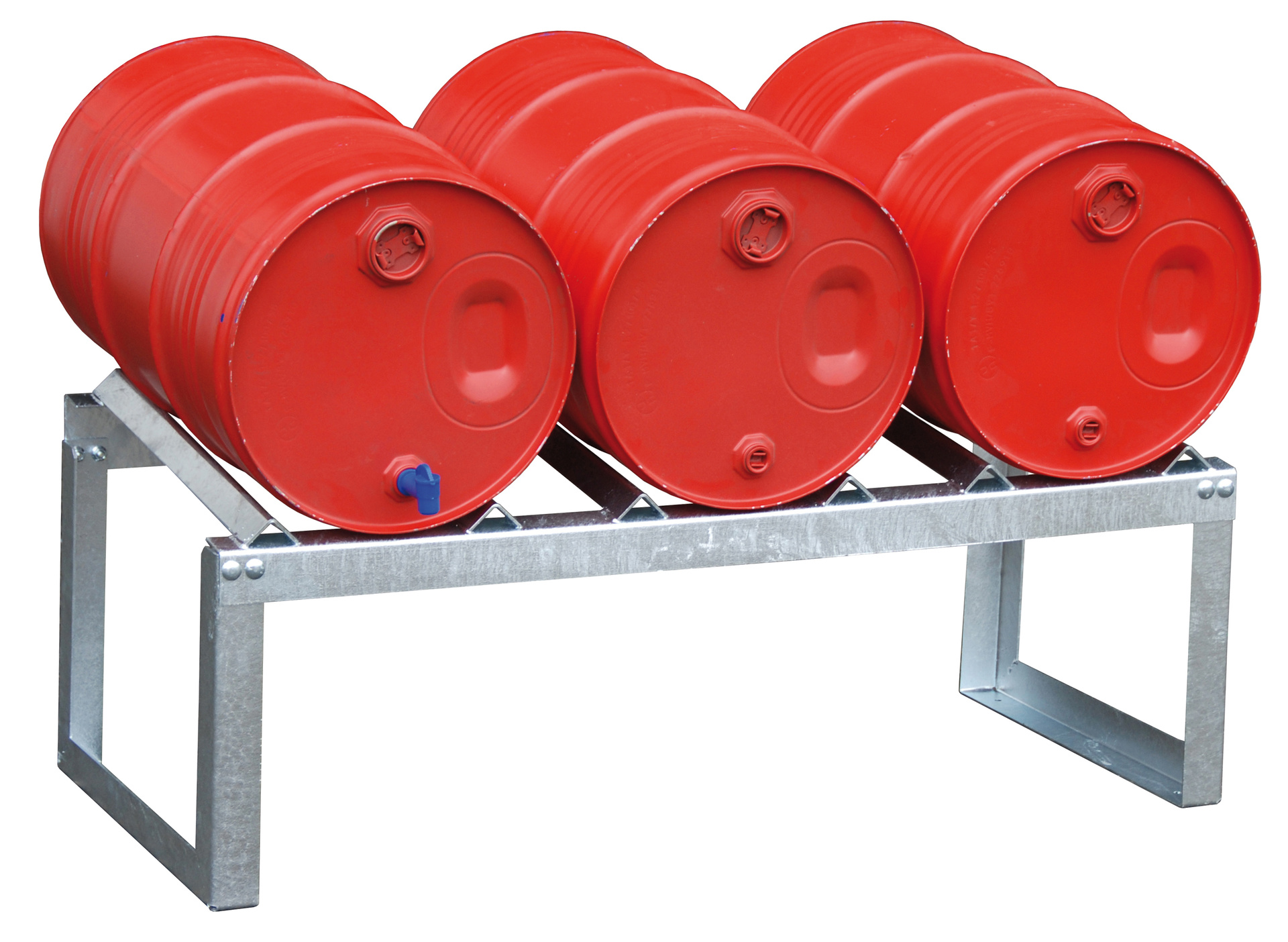 - Fassauflagen Typ FA, feuerverzinkt, für die liegende Lagerung und zum Abfüllen von 60- oder 200-l-Fässern, zum Aufstellen auf Auffangwannen mit Gitterrost, zerlegte Anlieferung