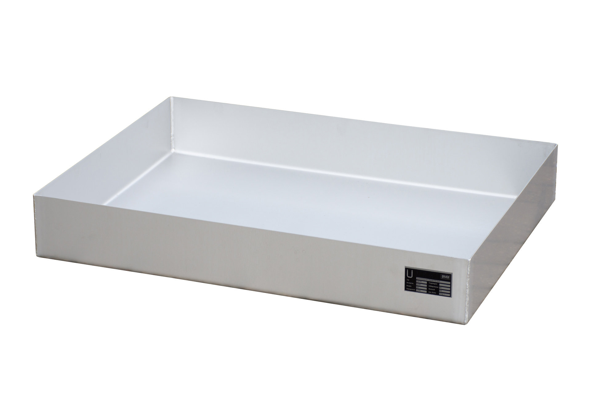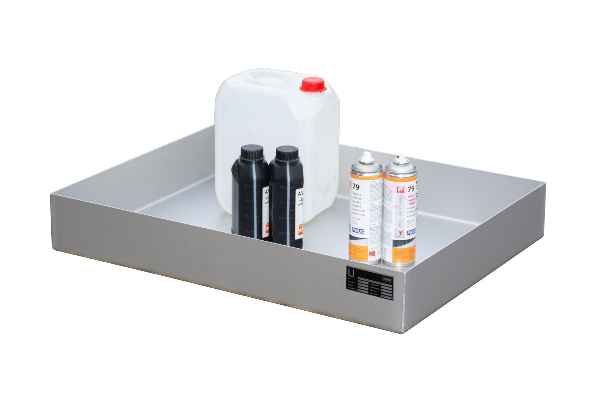 - Auffangwanne aus 2 mm Edelstahl zur Lagerung von aggressiven Medien