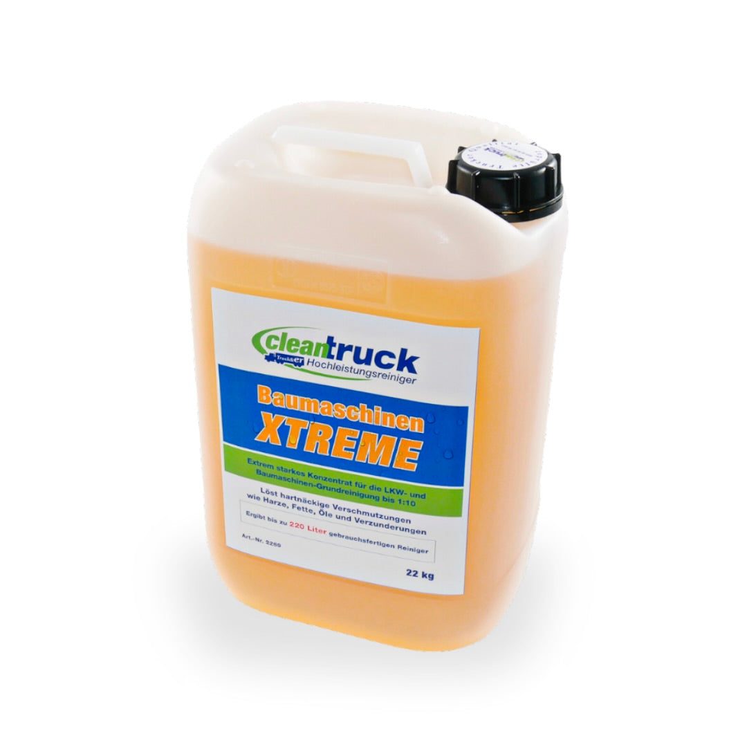 Der CleanTruck-Reiniger „Baumaschinen Xtreme“ (ehemals „Containerreiniger“) ist ein speziell entwickelter, alkalischer Grundreiniger, der härteste Anforderungen in der Transport- und Logistikbranche erfüllt. Er eignet sich hervorragend für Baumaschinen wie Kräne, Bagger und Kipper sowie für Maschinen im Agrar- und Holzbereich. Dank seiner starken Reinigungswirkung entfernt er effektiv Lacke, Klebstoffe, Harze, BIO-Öle, Fette, Ruß, Gummiabrieb und andere hartnäckige Verschmutzungen auf Containern, Fahrzeugaufbauten, Wechselbrücken, Silotransportern und LKW-Fahrgestellen.