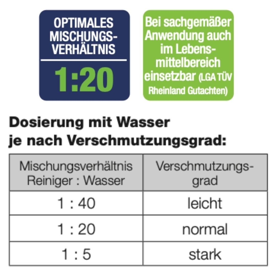 - pH-Wert: 10,50 – alkalischer Reiniger für starke Verschmutzungen.