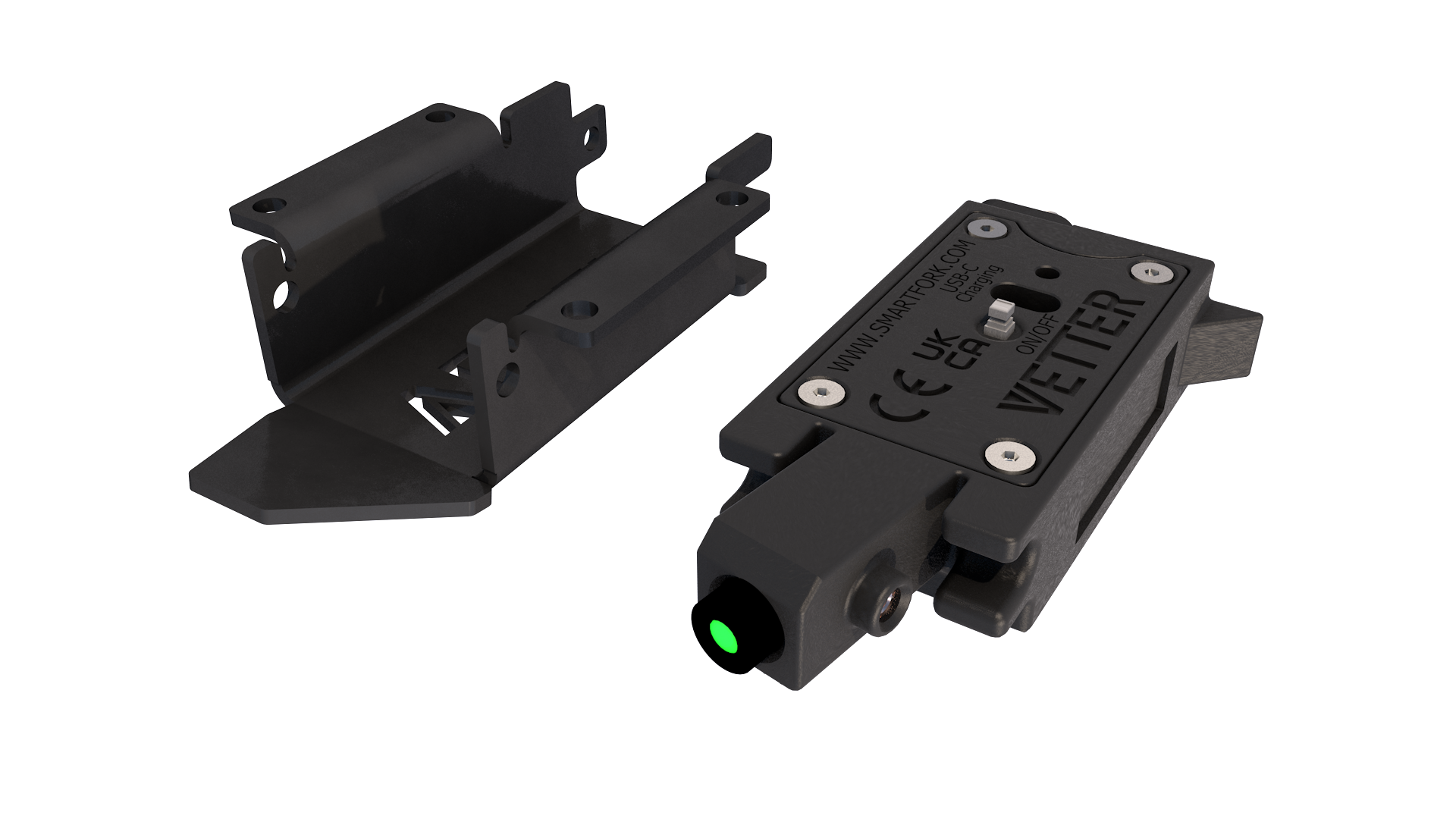 Für die Befestigung der Aufnahmeeinheit sind vier Bohrungen im Gabelblatt notwendig, zudem eine zusätzliche Bohrung in der Gabelspitze für den Laser. Eine Bohrschablone erleichtert eine einfache und passgenaue Montage.