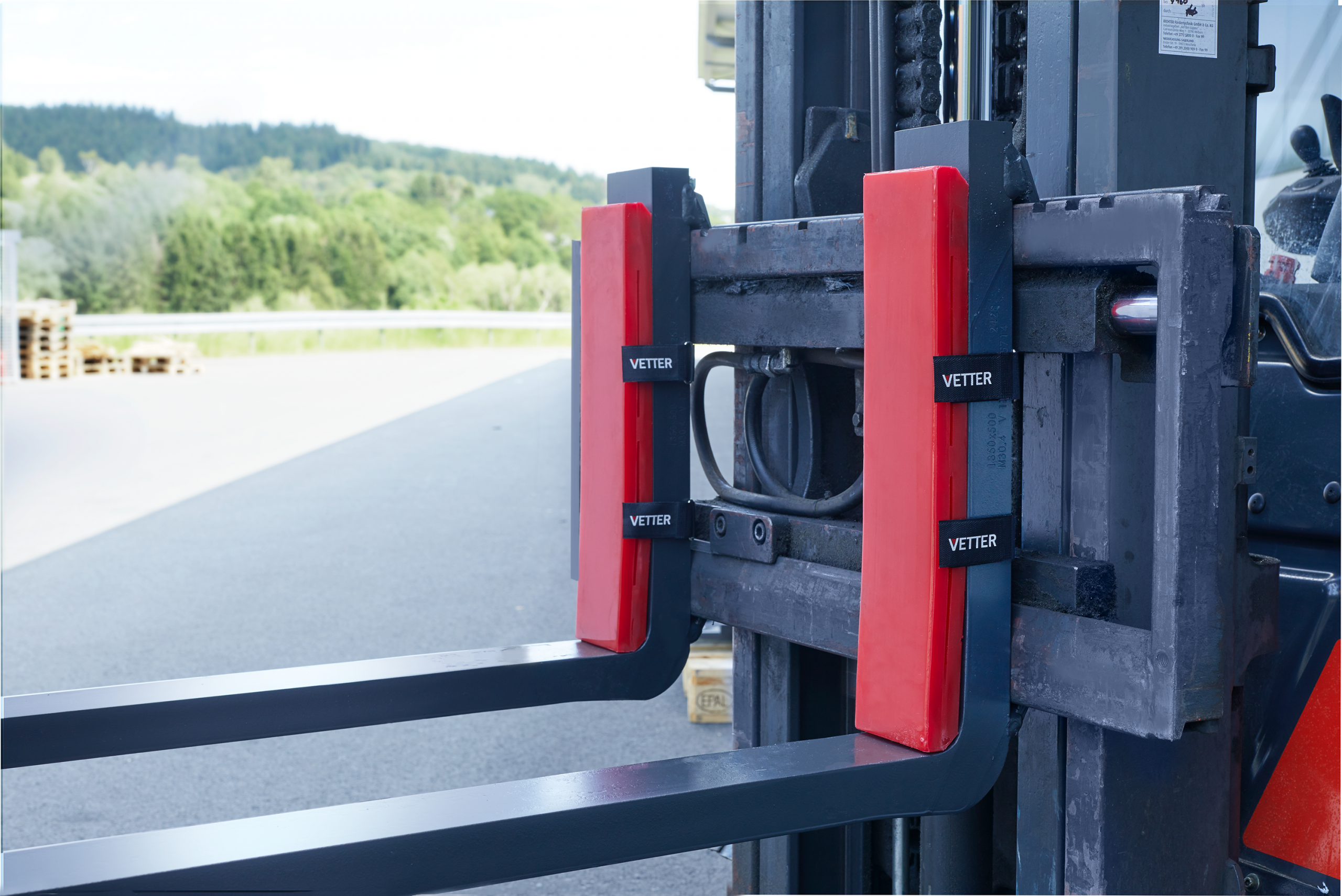 Der Prallschutz KOALA von VETTER bietet einen verbesserten Schutz für transportierende Ware und verhindert Schäden, die durch den Radius im Innenknick der Gabelzinken entstehen würden. Die Montage erfolgt schnell und einfach dank magnetischer Haftung oder höhenjustierbarer Klettbänder.